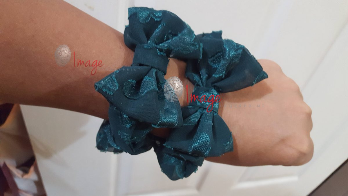 This elegant lifestyle photograph features a hand wearing two handcrafted fabric bow accessories in a deep green, teal-toned hue. The bows are made from textured lace or jacquard fabric, adding depth, softness, and a refined, handmade feel. Styled around the wrist, the accessories create a fashionable yet minimalist presentation. Soft indoor lighting and a neutral background keep attention on the craftsmanship and texture of the bows, making this image ideal for branding, product listings, editorial content, and creative design projects.
