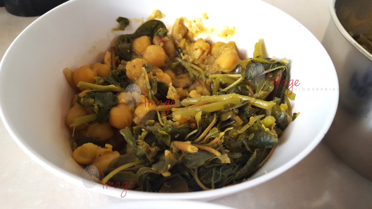 A stock photo of a bowl of cooked Bhagi and Chickpeas, a traditional dish of Trinidad and Tobago. A white bowl on the counter is filled with bright, green Bargie (spinach) leaves and yellow grains of chickpeas. A Caribbean delight.