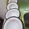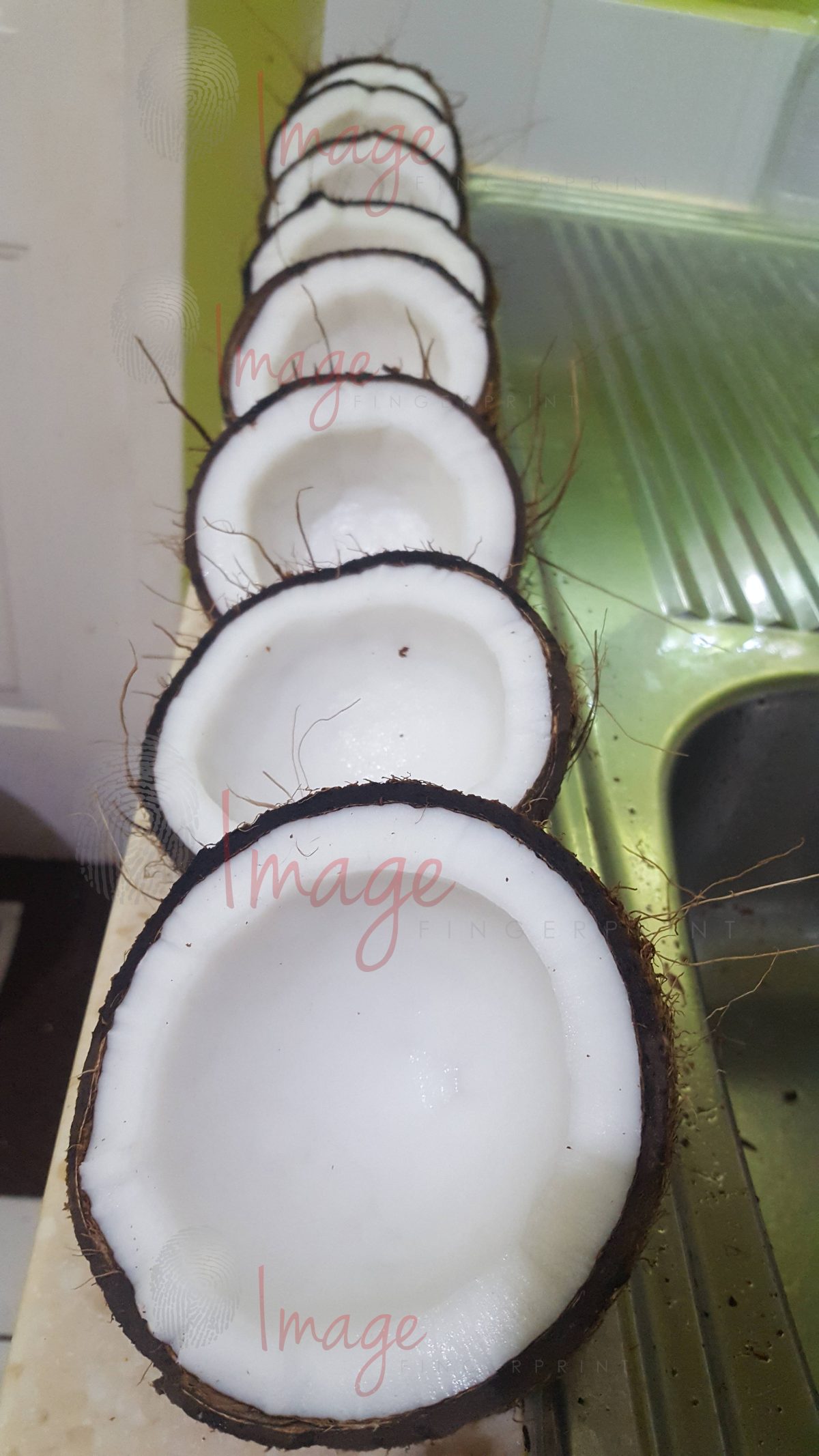 A series of dry coconuts cut neatly in half and lined up along a kitchen counter beside a stainless-steel sink — captured in natural indoor light. The photo highlights tropical textures, clean composition, and organic contrast, ideal for food blogs, sustainable living content, Caribbean culture projects, or agricultural storytelling.