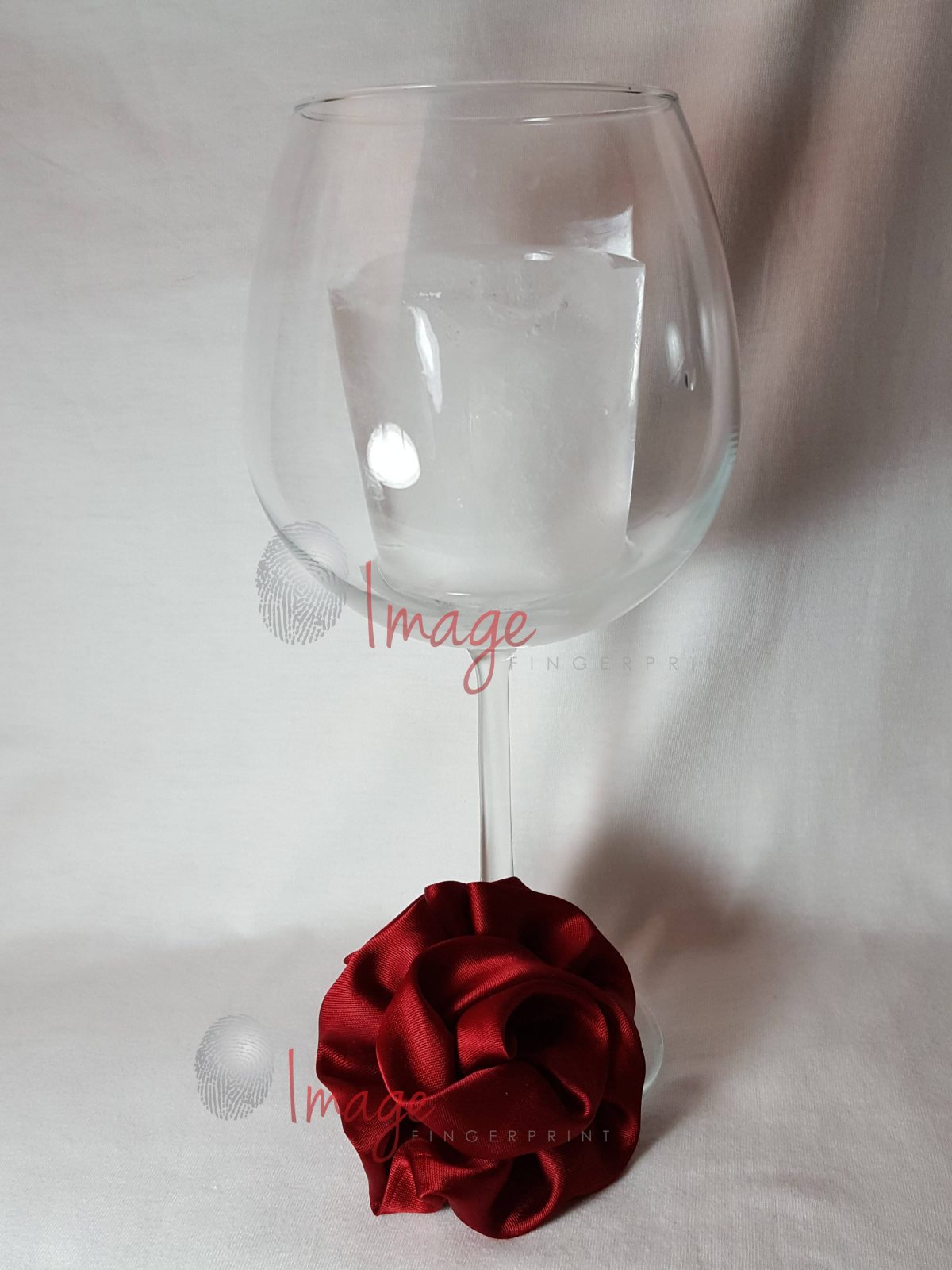Add a touch of elegance and handcrafted charm to your creative projects with this refined still-life stock photograph. The image features a clear wine glass set against a soft, neutral fabric background, accented by a beautifully crafted red satin hair rosette at its base.