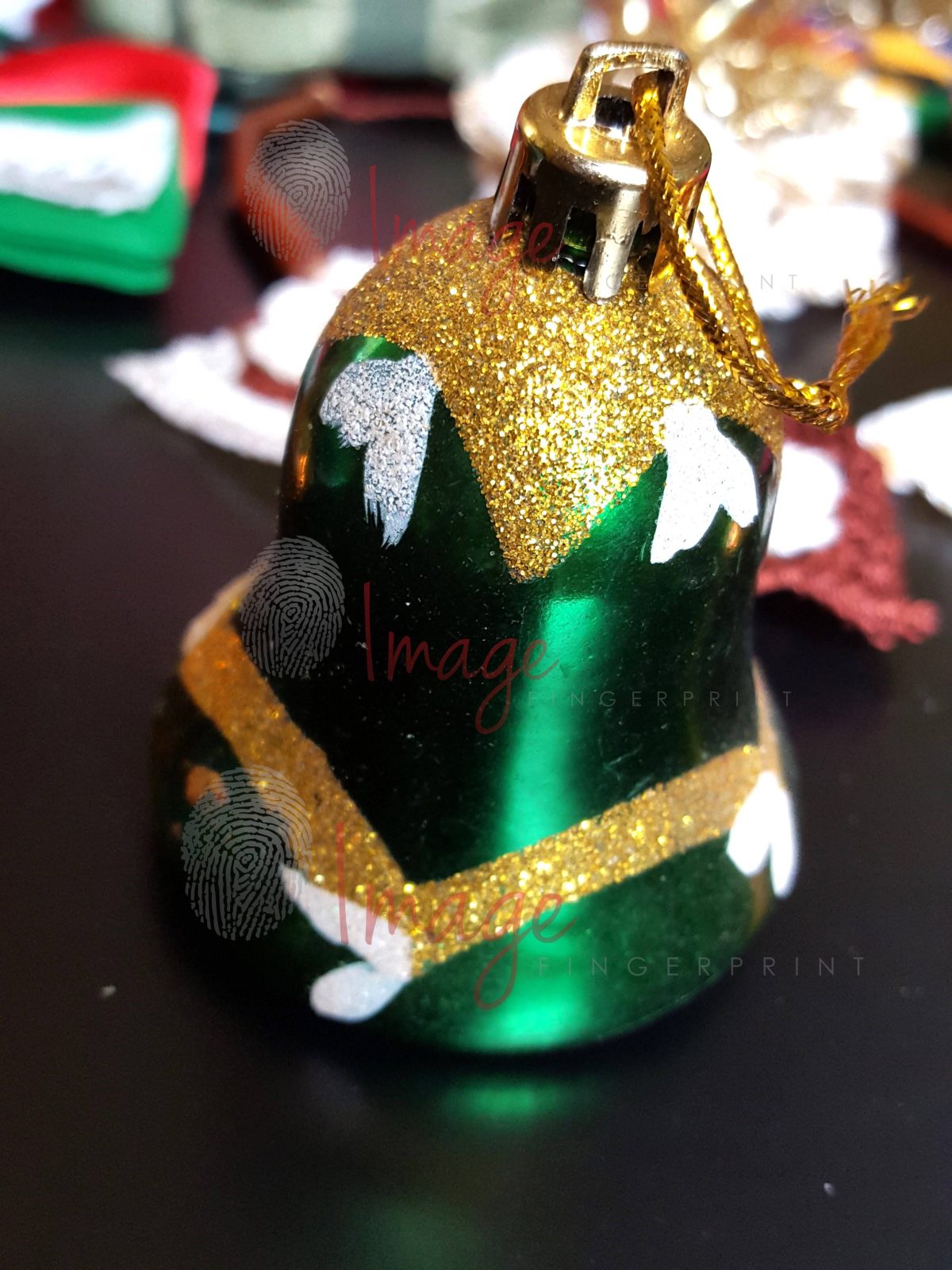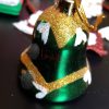 Bring the magic of the holidays into your creative projects with this vibrant close-up photograph of a green and gold Christmas bell ornament. The shimmering glitter details, soft light reflections, and handcrafted texture make this image perfect for cozy, festive, and nostalgic seasonal designs.