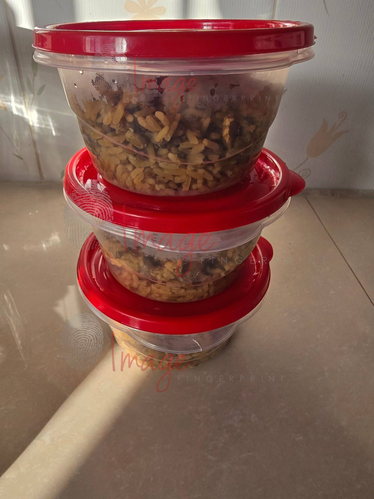 Authentic Caribbean food photography highlighting the meal preparation and storage. Three transparent food containers with flaming red covers, stacked one on top of the other like a tower. Filled with smokin,g hot meals ready for grab and go. Perfect for illustrating home cooking, recipe blogs, or kitchen-focused articles. This image captures the textures and colours of real ingredients in a natural light setting, ideal for culinary storytelling and promotional content.