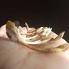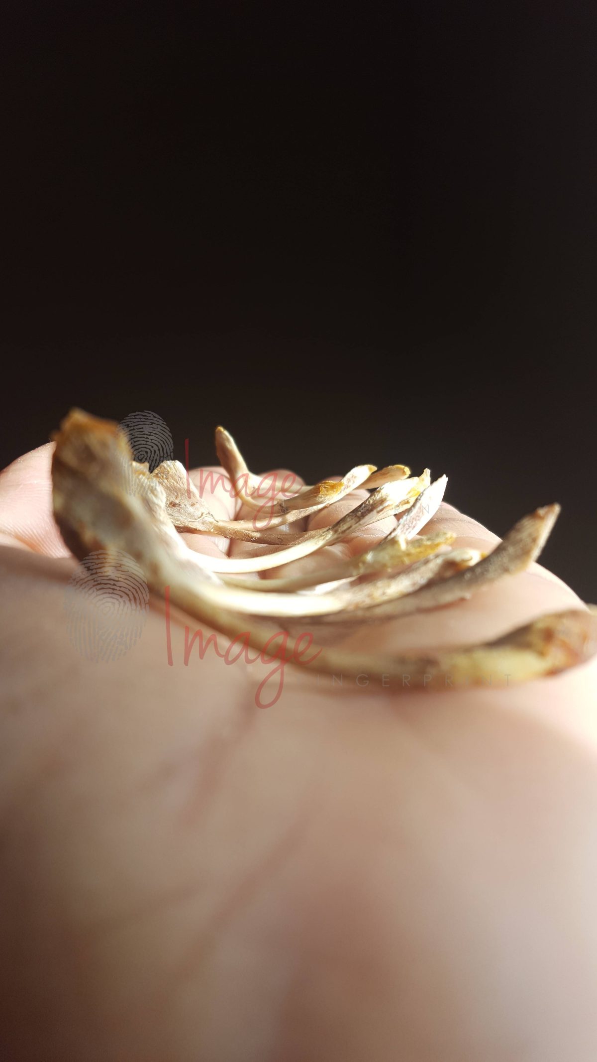 This striking macro photograph captures a handful of dried chicken wishbones, arranged naturally in the palm of a hand. The soft, warm lighting brings out the texture of each bone while the dark background creates dramatic contrast and depth.