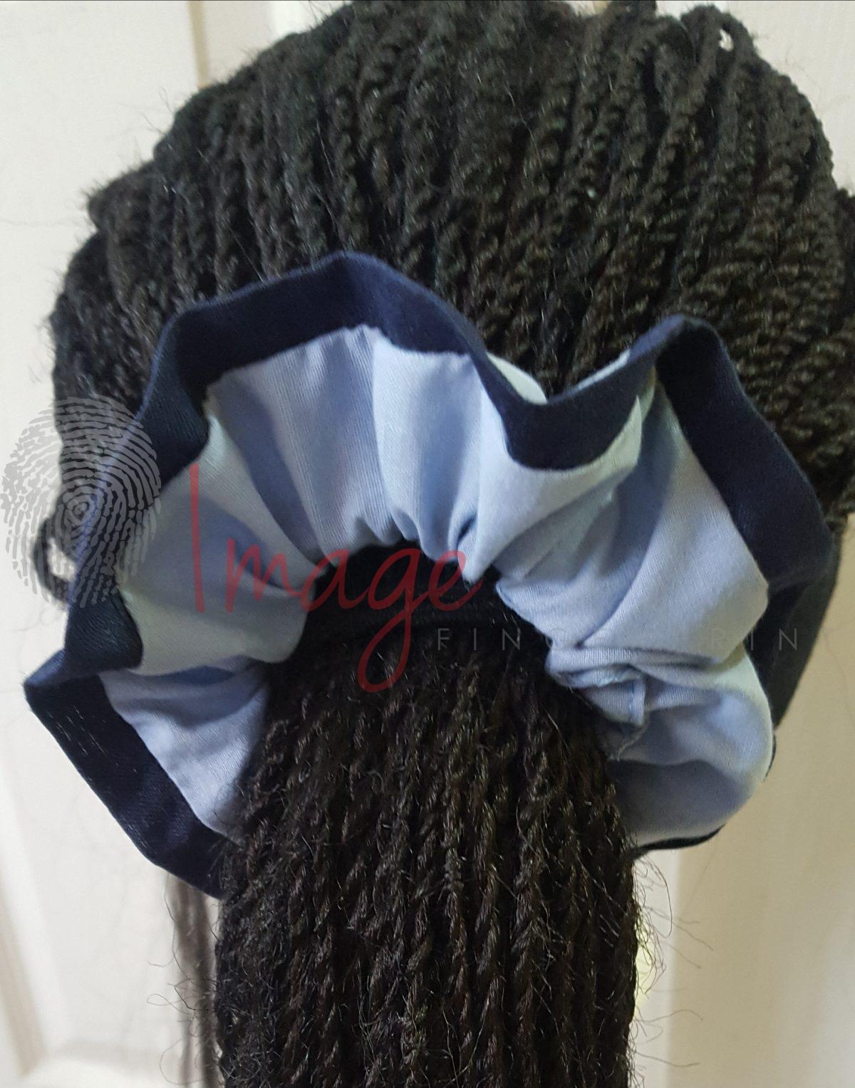 This striking photograph features a handmade fabric scrunchie securing a head of beautifully braided hair. The scrunchie—stitched in a cool two-tone palette of soft blue and navy—showcases the artistry and comfort of handmade fashion accessories.