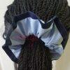 This striking photograph features a handmade fabric scrunchie securing a head of beautifully braided hair. The scrunchie—stitched in a cool two-tone palette of soft blue and navy—showcases the artistry and comfort of handmade fashion accessories.